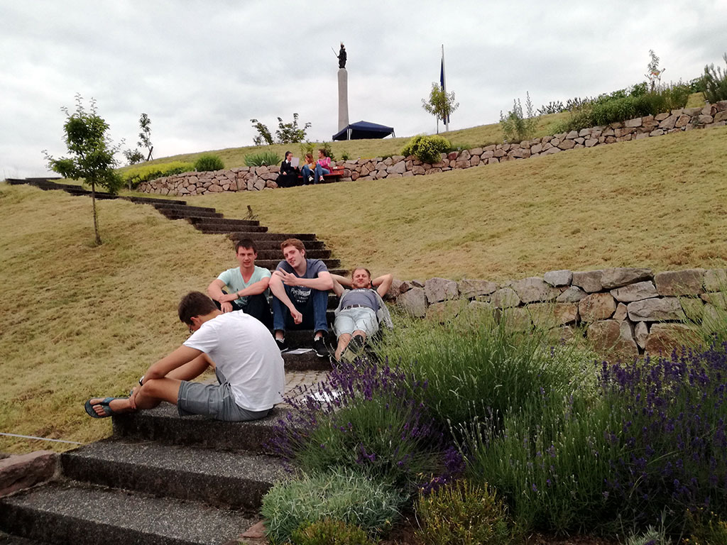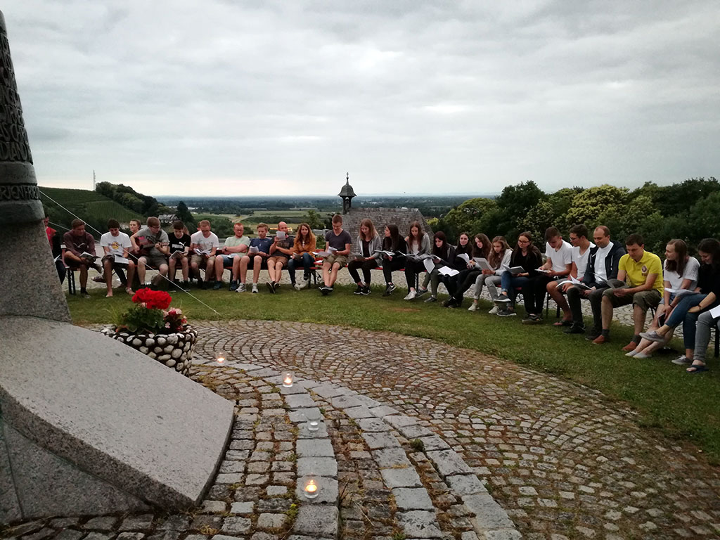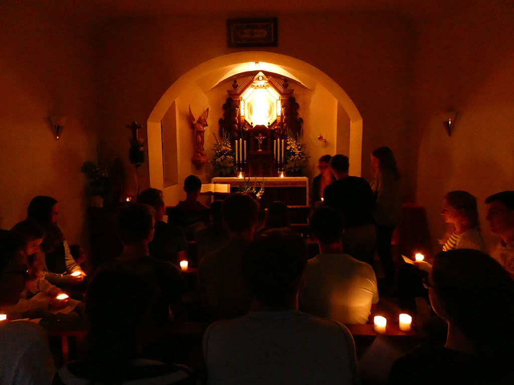 Weiter konnten wir dann eines von drei Themen wählen: Vorsehungsglaube, Persönliches Ideal und der neue Mensch. Mit diesen haben wir uns in Kleingruppen genauer beschäftigt, unsere eigene Meinung geschärft und mitbekommen, was Pater Kentenich dazu gesagt hat. Nach dem Austausch gab es an der dritten Station dann die Möglichkeit uns zu überlegen, wie wir das Liebesbündnis konkret leben; wie wir Maria nacheifern und wie wir zu „Sonnenkindern“ werden können. Diesen Begriff hat Kentenich gebraucht, um zu verdeutlichen, dass wir klar sein sollen in dem was wir tun und das auch nach außen verbreiten, kurz dass wir in die Welt strahlen sollen. Maria war so ein Sonnenmensch, den wir uns mit unserem Liebesbündnis zum Vorbild genommen haben. Deshalb sind wir zum Abschluss in Stille ins Heiligtum eingezogen, haben unsere „Krugpost“ darbringen können und gemeinsam unseren Bund mit Gott, der Gottesmutter und untereinander erneuert.