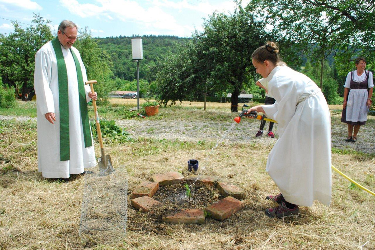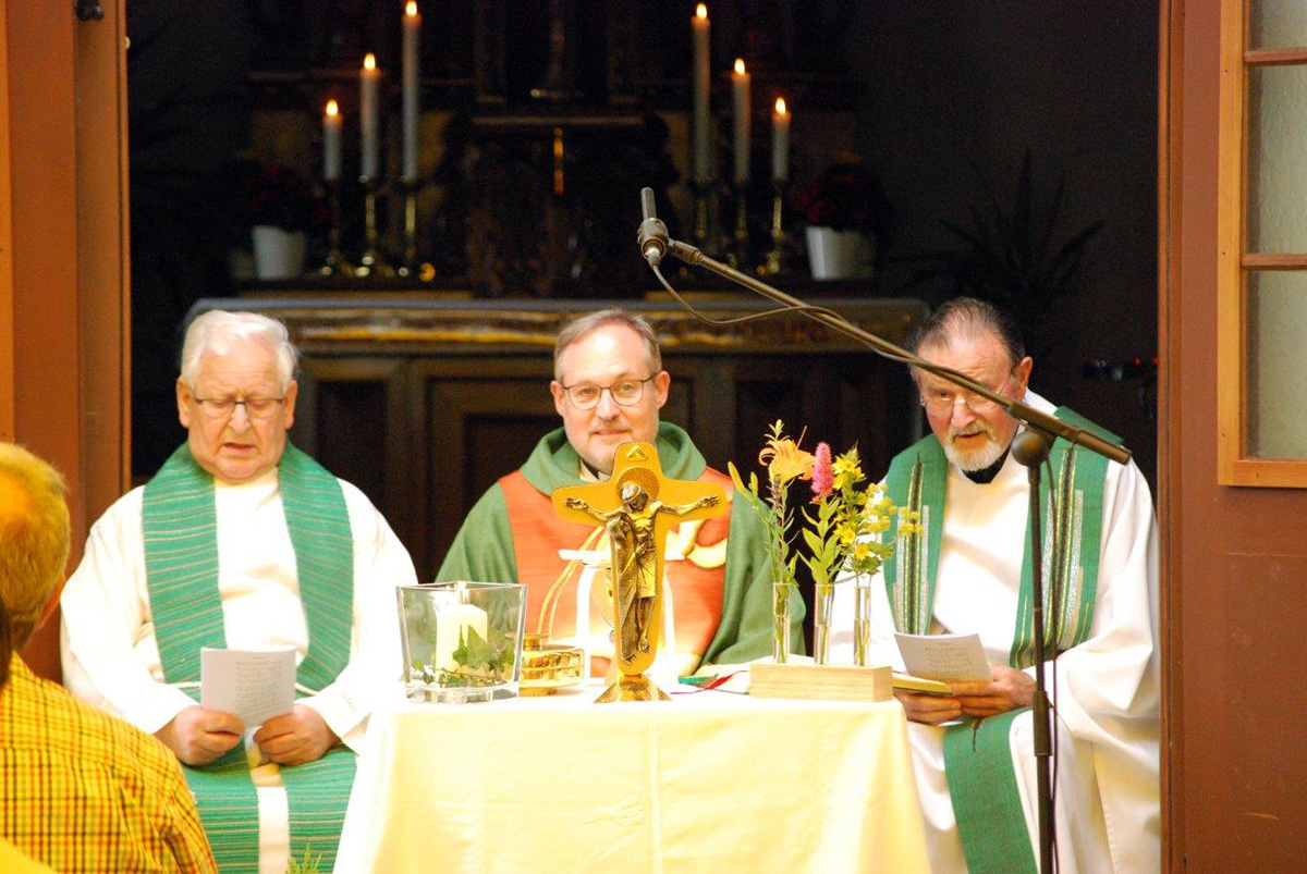 Vor dem Festgottesdienst begrüßte Regioleiterin Maria Dengler die Gäste und mit Pfarrer Rennemann, Pfarrer Gekle und Pfarrer Lang drei Priester, die den Gottesdienst mitfeierten. Sie stellte als Symbol für die Arbeit der Schönstatt-Bewegung den Samen von Mammutbäumen vor: Er ist ziemlich klein und kann zu einem Riesenbaum heranwachsen. Dieser Gedanke stimmte auf das Evangelium vom Senfkorn ein. Dazu trug der Hauptzelebrant des Gottesdienstes, Diözesanleiter Pfarrer Rennemann in der Predigt seine Gedanken bei: