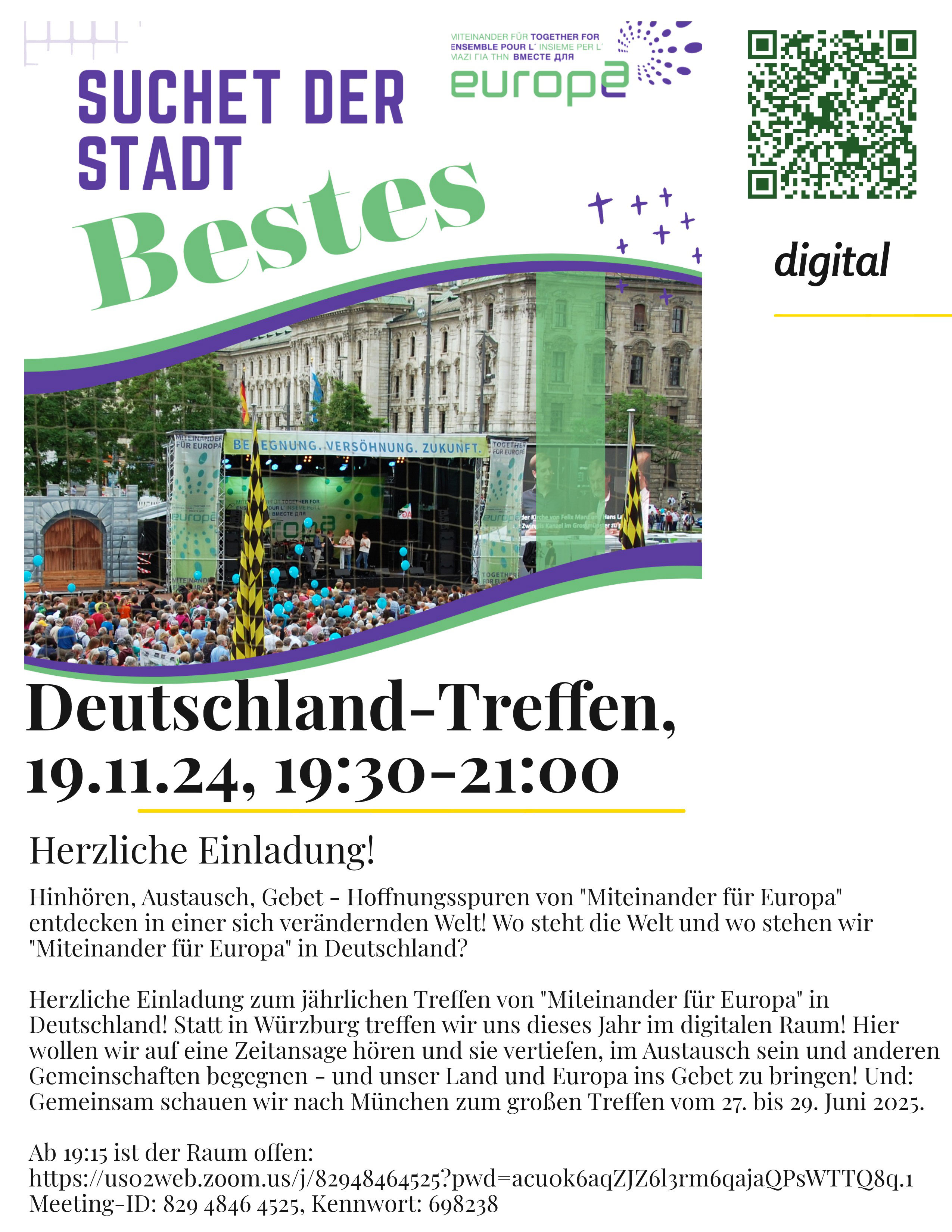 Hbre. Am 19. November 2024 lädt das Netzwerk „Miteinander für Europa“ zu seinem jährlich stattfindenden „Deutschlandtreffen“ ein. Anders als in vorhergehenden Jahren findet das Treffen in diesem Jahr nicht in Präsenz in Würzburg statt. Vielmehr wird in diesem Jahr von 19.30 Uhr bis 21.00 Uhr zu einer Begegnung im digitalen Raum eingeladen. „Hier“, so heißt es auf dem Einladungsplakat, „wollen wir auf eine Zeitansage hören und sie vertiefen, im Austausch sein und anderen Gemeinschaften begegnen - und unser Land und Europa ins Gebet bringen!“