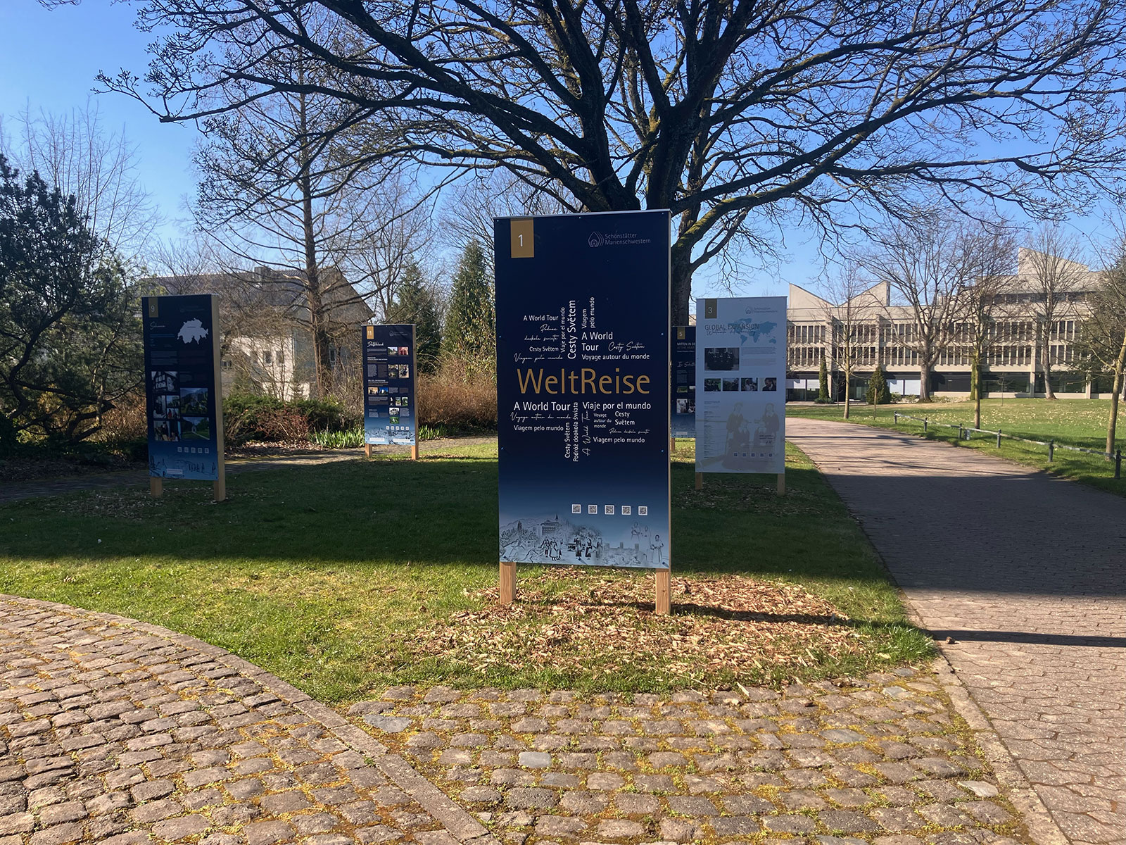 Die Reise ins Heute – WELTREISE – lädt in den Outdoor-Bereich zwischen Mutterhaus und der Dreifaltigkeitskirche ein: Auf 20 großformatigen Tafeln wird sichtbar, wie vielfältig die Gemeinschaft heute weltweit wirkt – in Bildung, Seelsorge, Sozialprojekten und vielem mehr.